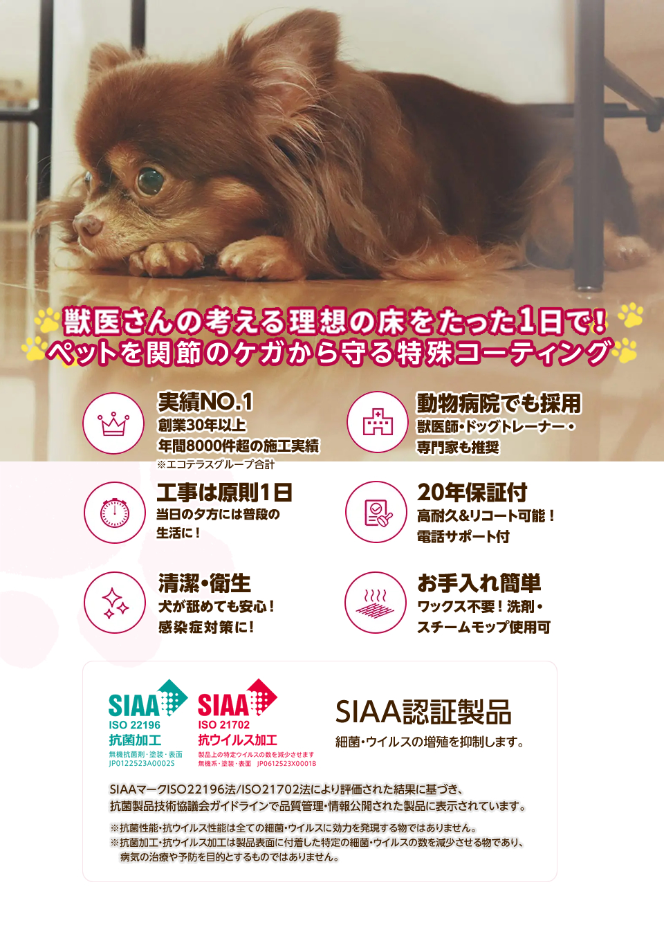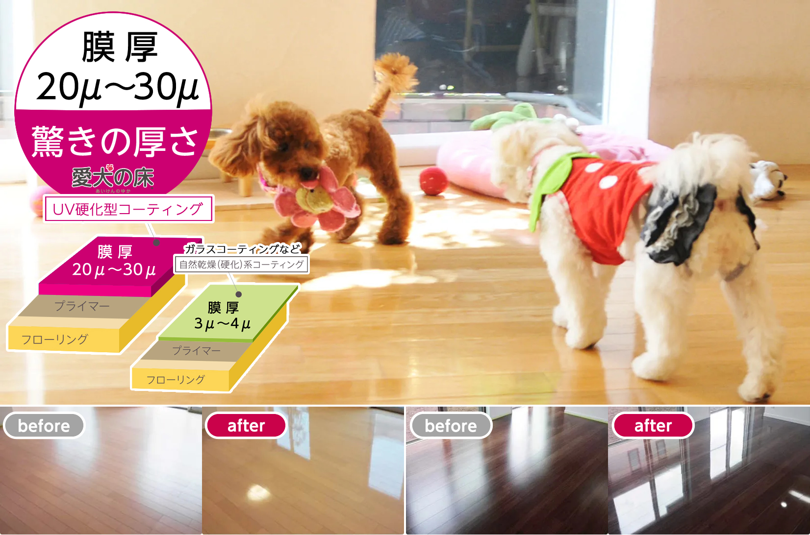 専門会社20年以上のノウハウで、すべりやすいフローリングに「室内犬が快適に歩行できるグリップ性」を与えます。