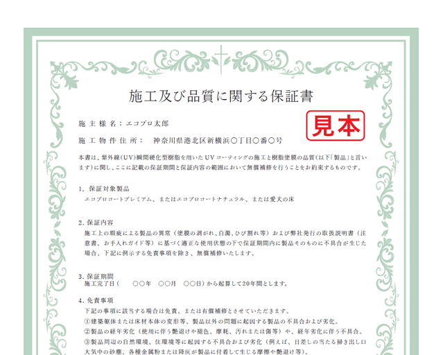 エコプロコートでは、フロアコーティングを施工した後、20年間有効の保証書を発行しております。これから長く続く「美しさ」「快適さ」をお約束する書類です。大切に保管してください。また、保証適用外となってしまうような、思わぬトラブルでフロアコーティングを破損させてしまった場合なども、お気軽にご相談ください。できるかぎりご希望にかなう、最善の方法で対応いたします。