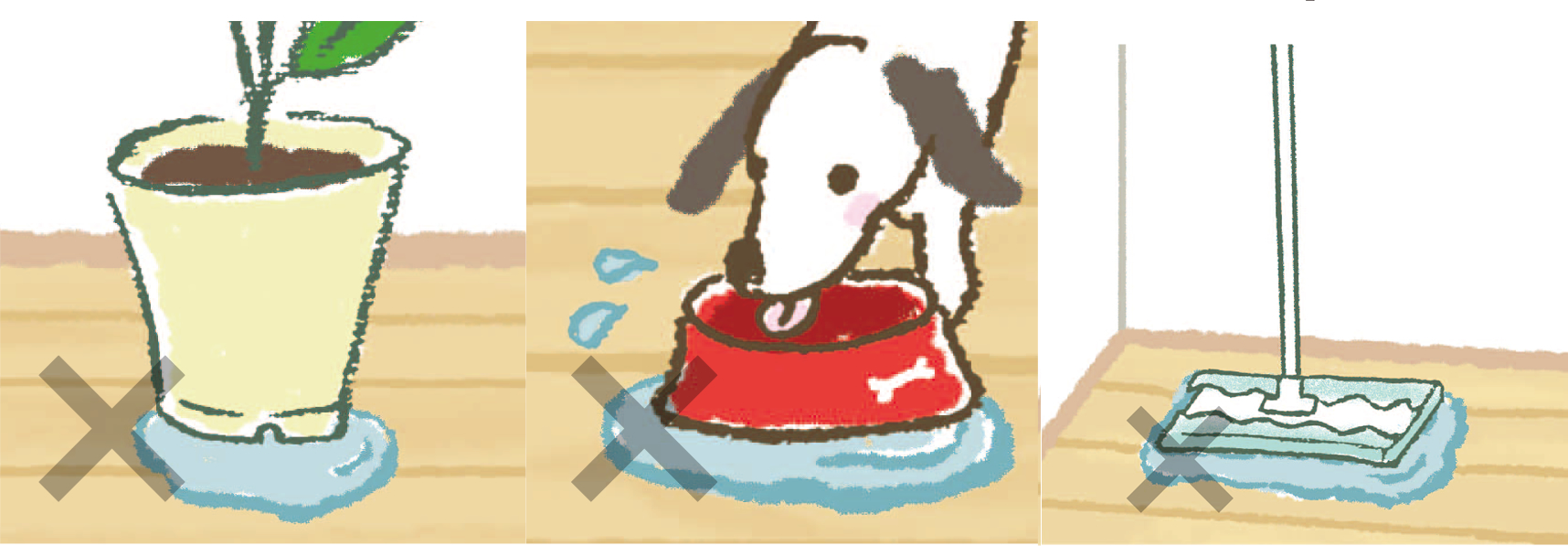 ※長時間放置によるフローリングの変色やふくれ、その部分からのはがれは、保証対象外となりますのでご注意ください。